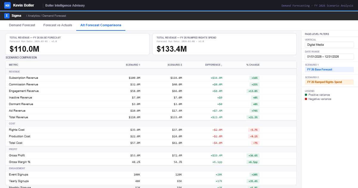 In our second iteration after our initial Streamlit application, I led the development of a Sigma-based AI and data application that projects signups, subscribers, subscription and ad revenue, and engagement at the contract level across all of our sports verticals. The underlying Python forecasting engine uses a cohort-based retention framework, historical plan mix, and viewership and live minutes 1P data to allocate revenue across signup, engagement, inactive, and dormant components. Ad revenue layers in based on forecasted engagement and inventory monetization, producing contract-level base forecasts that can also be compared dynamically against alternative portfolio scenarios.